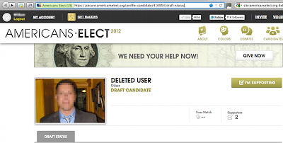UPDATE (8:00 AM ET, May 10): As of this time, Americans Elect still has posted no notice on its web site, has issued no press release, nor has it notified delegates via email regarding the expiration of the May 8 deadline for support clicks to qualify for its previously-scheduled (and now canceled, according to press secretary Wachtel) May 15 first-round primary ballot. We wonder what kind of 'democratic' organization would simply refuse to communicate with its own members?